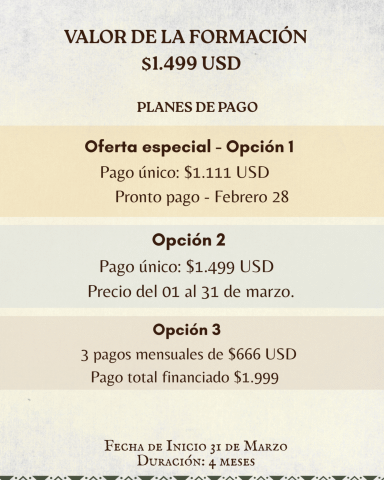 Además, la formación es guiada por Claudia la Maga Ancestral, con más de 25 años realizando ceremonias ancestrales, lo que garantiza profundidad, ética y experiencia aplicada.